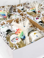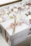 All Giftboxes come in a high quality white gloss box - 8"x8"x6, shreds and dried florals on top and your choice of ribbon depending on the theme!