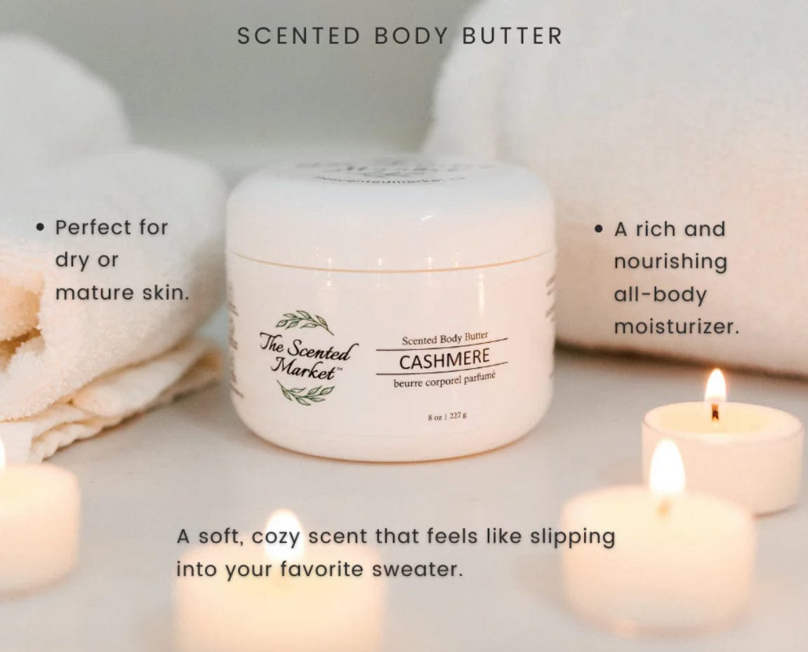 The scented markets 235 mls of luxurious, silky, whipped body butter goes on like a dream, leaving your body soft and moisturized all day long. A rich and intensive all-body moisturizer that is perfect for dry or mature skin.