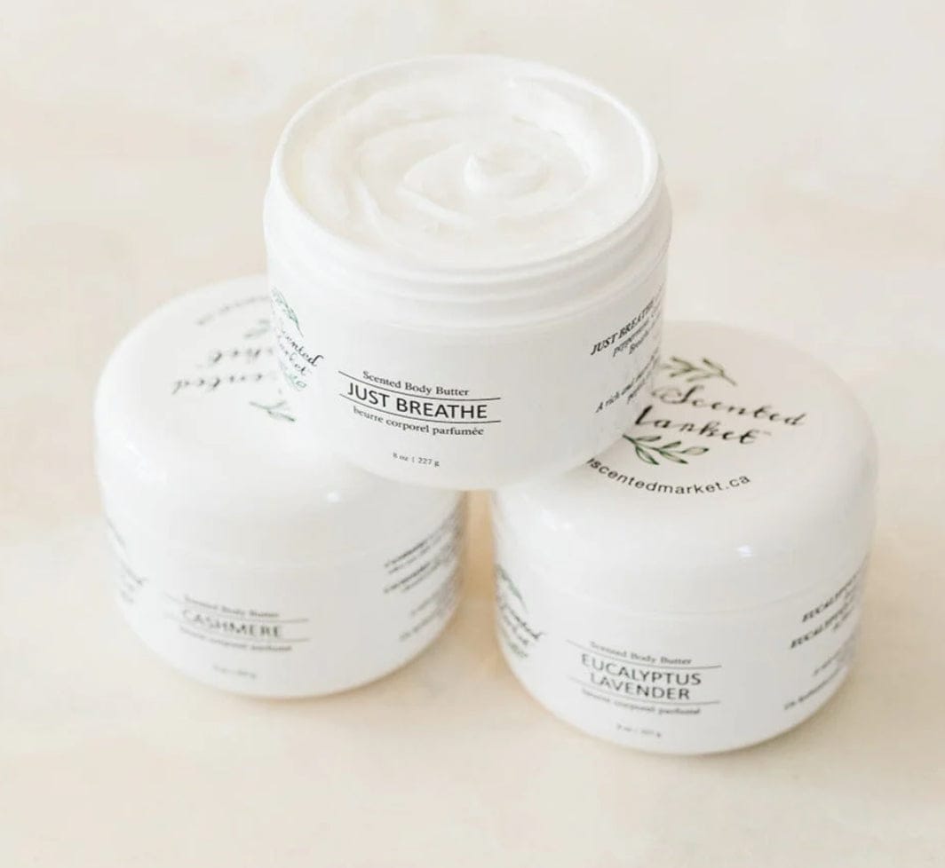 Each jar is infused with shea butter, jojoba oil, sunflower oil and glycerin and scented with beautiful essential oils. There are two scents available.