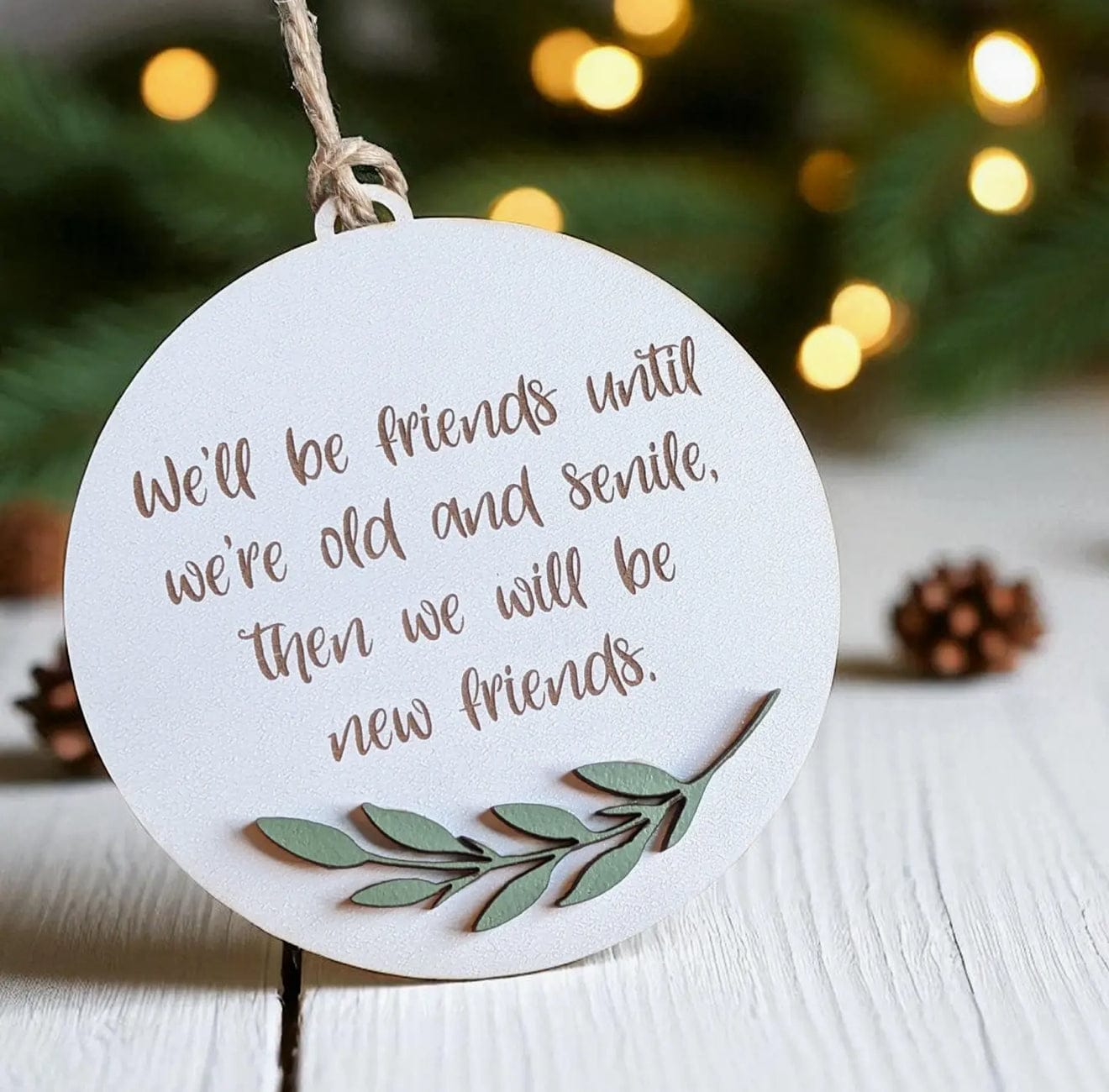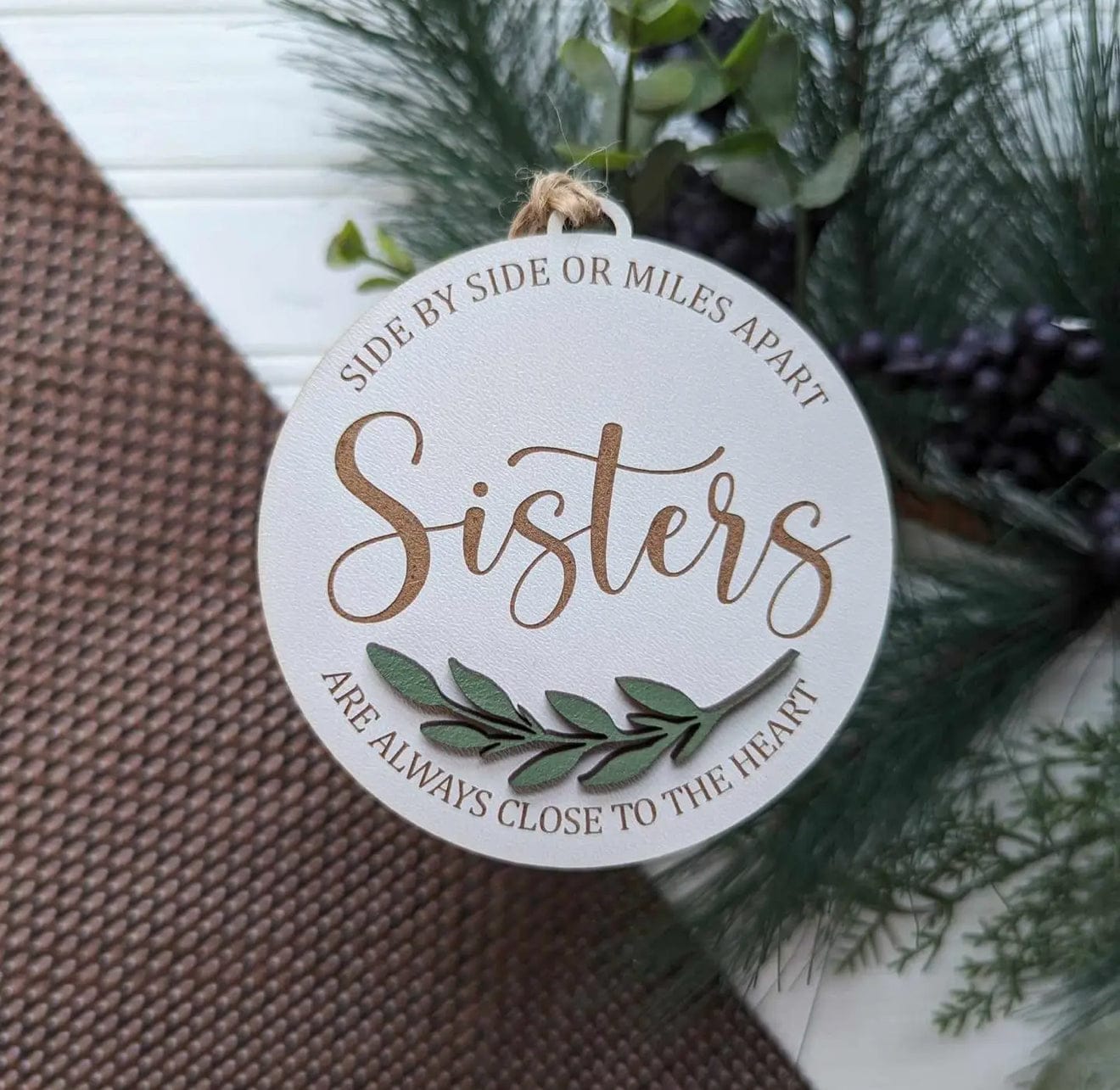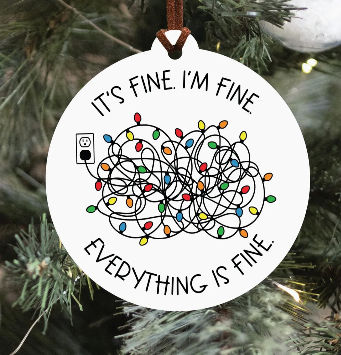 Diameter: 3.25 inches Printed onto 1/8" thick white acrylic with permanent ink. Finished with a brown suede string and individually packaged. Ornaments are white on the back.